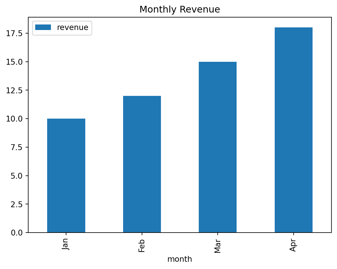 sales.plot(x= "month" , y= "revenue" , kind= "bar" , title= "Monthly Revenue" );